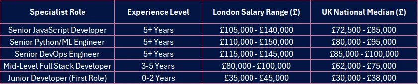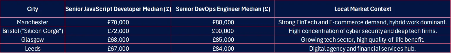 The regional variation in the UK remains a defining feature of the salary landscape. While London maintains its premium, major regional hubs are closing the gap for high-value Specialist Tech Roles.