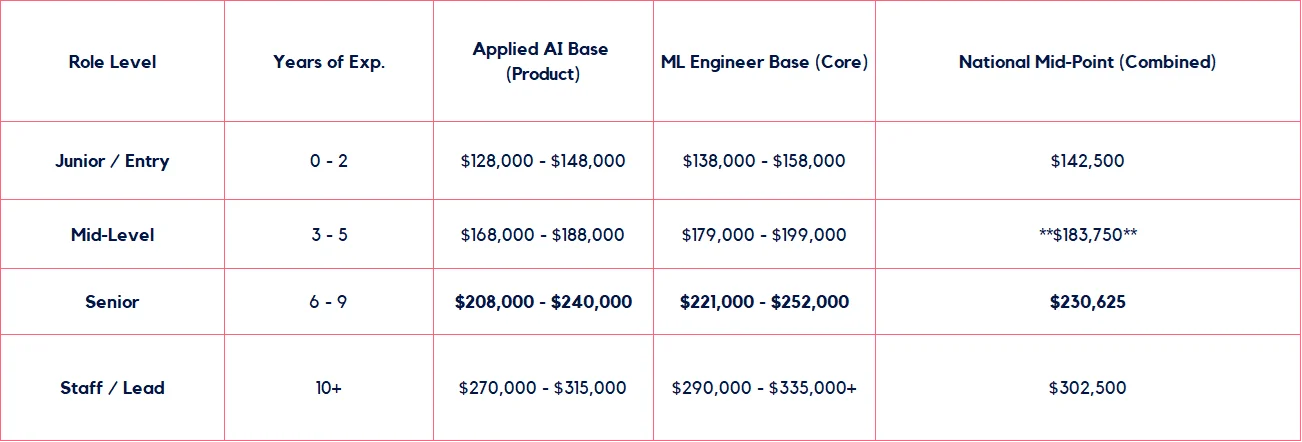 What is the national midpoint for a Machine Learning Engineer? Based on our 2026 zonal data, the national midpoint for a Mid-Level ML Engineer is $189,375, while a Senior ML Engineer is $236,875.
